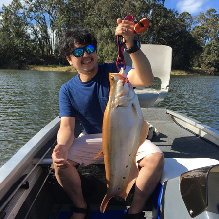 英名:Clown knifefish, Featherback, Spotted knifefish 学名: Chitala ornata 正式名称はクラウン・ナイフフィッシュ、またはクラウン・フェザーバック。クラウンは王冠ではなくて、ピエロのほうのCLOWN。ベトナム、カンボジア、タイ、ラオス原産。 ウィルソン湖には三年ほど前から見かけるようになりました。最近ではかなりの数がいると思われます。空気呼吸で上がってくるのでよくわかります。「放流したのはオレだ」という男にも偶然会いましたが、1尾や2尾を放流して三年程度でこれだけの数、サイズになるというのはもっと前からいたのかも知れませんが、本当のところは不明。 夜行性だからなのか、昼間にルアーではなかなか釣れません。以前、2回ほどお客さんのルアーにでましたが、2回ともバレました。 ハワイ以外の米国でのピーコックバスの生息地、フロリダの運河網にも生息してます。 |